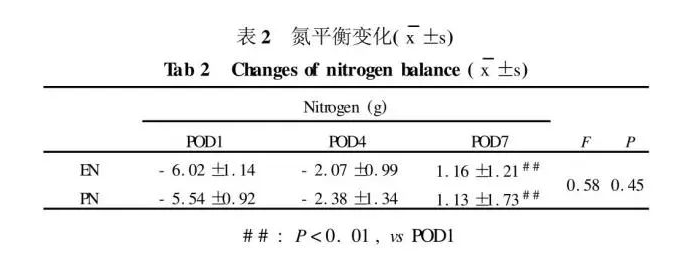 本組病例中PN對(duì)腸道功能有明顯的抑制作用,表現(xiàn)為術(shù)后腸道運(yùn)動(dòng)功能恢復(fù)較慢,PN期間及停藥后早期患者食欲受到抑制。而EN能有效地利用腸道吸收功能,刺激腸道蠕動(dòng),促進(jìn)腸道功能的全面恢復(fù)。EN及PN均能有效促進(jìn)正氮平衡,減少脂肪及肌肉分解,維持血漿蛋白水平。而EN所需費(fèi)用僅為PN的1/4,因此EN是較PN更為經(jīng)濟(jì)的營(yíng)養(yǎng)治療手段。