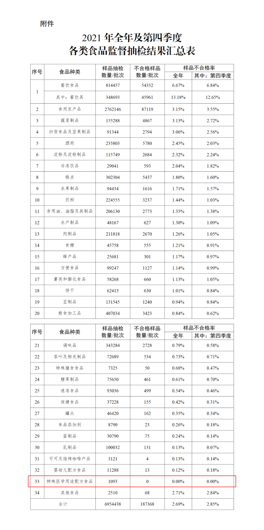 2022年5月6日,市場監(jiān)管總局發(fā)布了關(guān)于2021年市場監(jiān)管部門食品安全監(jiān)督抽檢情況的通告。2021年,全國市場監(jiān)管部門完成食品安全監(jiān)督抽檢6954438批次,依據(jù)有關(guān)食品安全國家標(biāo)準(zhǔn)等進(jìn)行檢驗(yàn),發(fā)現(xiàn)不合格樣品187368批次,監(jiān)督抽檢不合格率為2.69%,可喜的是,特醫(yī)食品全年共抽檢樣品1093批次,不合格率為零。