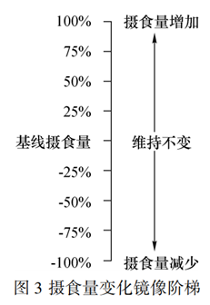 簡易膳食評價攝食量刻度尺與攝食量變化鏡像階梯可用于量化攝食量與攝食情況變化。攝食量刻度尺包括 0 ~ 10 級,其中 0 代表完全沒吃, 6 以上表示攝入良好,10 代表吃得最多。攝食量變化鏡像階梯以基線攝食量為 0,0 ~ 100%為攝食量增加, -100% ~0 為攝食量減少,患者可根據(jù)自己的攝食情況選擇相應(yīng)數(shù)字。具體評價標(biāo)準(zhǔn)見圖 2、3。