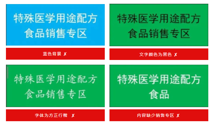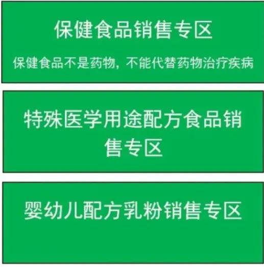 規(guī)范設(shè)立提示牌,醒目注明“保健食品銷售專區(qū)(專柜)”“嬰幼兒配方食品銷售專區(qū)(專柜)”“特殊醫(yī)學(xué)用途配方食品銷售專區(qū)(專柜)”字樣,提示牌為綠底白字,字體為黑體。