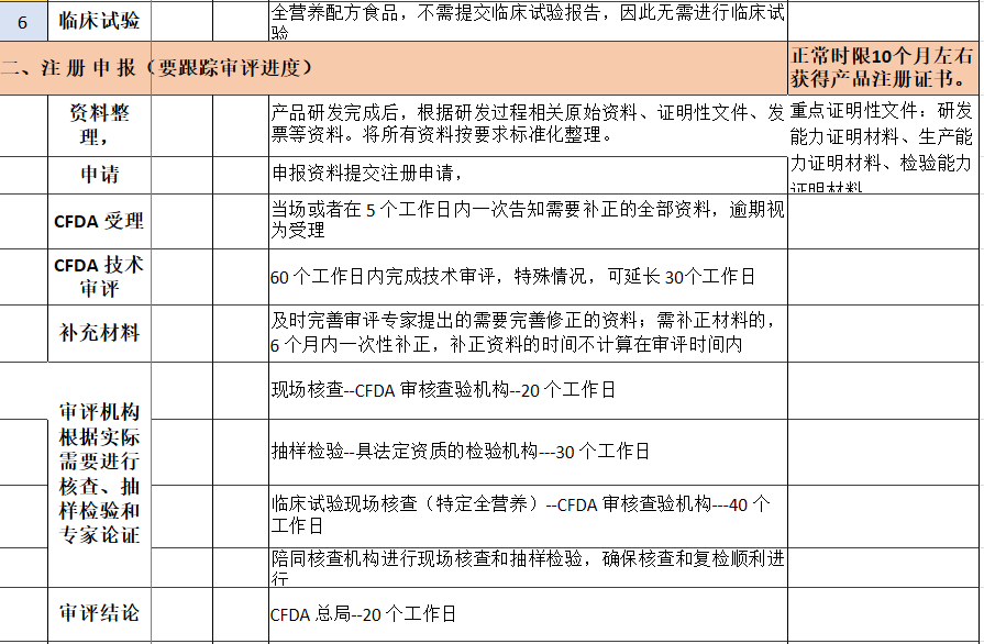 從初期的資料準(zhǔn)備到檢測(cè)到官方審評(píng),全營(yíng)養(yǎng)配方食品、非全營(yíng)養(yǎng)配方食品、特殊醫(yī)學(xué)用途嬰兒配方食品的注冊(cè)申報(bào)周期通常為1到2年。特定全營(yíng)養(yǎng)配方食品因?yàn)樾枰才排R床試驗(yàn),因此整個(gè)申報(bào)周期至少在3年以上(拜侖斯特)。