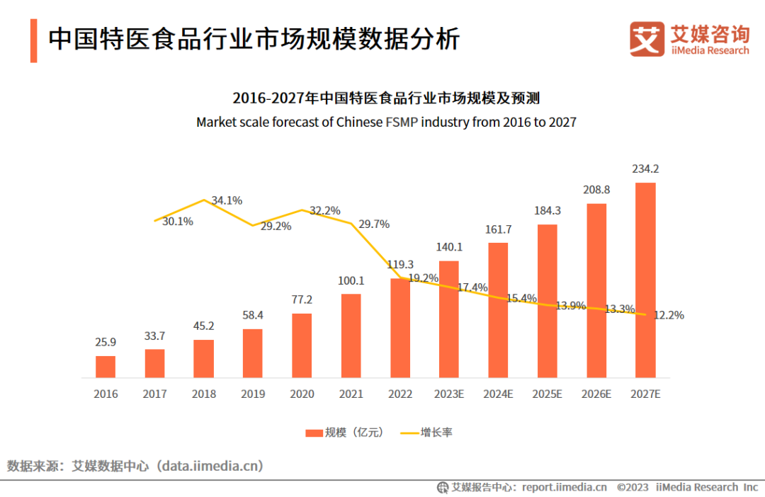 近年來,中國特醫(yī)食品行業(yè)市場規(guī)模持續(xù)擴(kuò)大,特別是3年疫情使得提高免疫力的食品和功能性食品受到消費(fèi)者歡迎,市場增速較為可觀。iiMedia Research(艾媒咨詢)數(shù)據(jù)顯示,未來在人口老齡化、下游需求不斷加大及醫(yī)院營養(yǎng)科建設(shè)發(fā)展等因素驅(qū)動下,特醫(yī)食品憑借在臨床營養(yǎng)支持中不可替代的作用,其市場規(guī)模將進(jìn)一步增長,預(yù)計(jì)2027年中國特醫(yī)食品市場規(guī)模將達(dá)234.2億元。