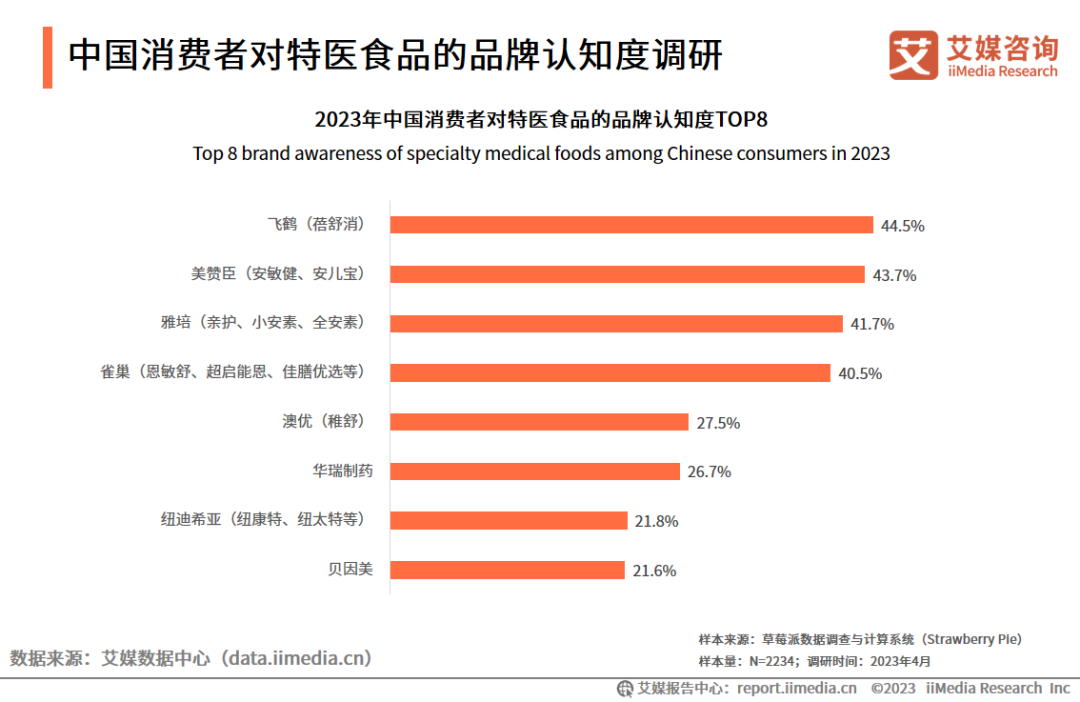 iiMedia Research(艾媒咨詢)調(diào)研數(shù)據(jù)顯示,特醫(yī)食品消費(fèi)者認(rèn)知度TOP4的品牌依次為飛鶴(44.5%)、美贊臣(43.7%)、雅培(41.7%)、雀巢(40.5%),這4個(gè)品牌的消費(fèi)者認(rèn)知度較為接近。消費(fèi)者認(rèn)知度較高的特醫(yī)食品品牌還有澳優(yōu)、華瑞制藥、紐迪希亞、貝因美,分別位列第5-8位。