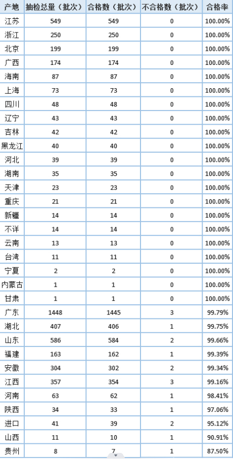 注:1、各省區(qū)市按照抽檢合格率由高到低排序;