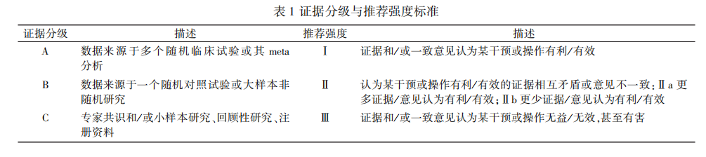 本指南中各部分內(nèi)容由國家市場監(jiān)管重點實驗室(腫瘤特醫(yī)食品)、中國營養(yǎng)保健食品協(xié)會特殊醫(yī)學用途配方食品應用委員會及中國抗癌協(xié)會腫瘤營養(yǎng)專業(yè)委員會專家及其團隊負責,成立工作小組后通過評估現(xiàn)有證據(jù),制訂推薦內(nèi)容,并評估應用指南推薦引起的相關(guān)臨床獲益、成本和風險。專家共識實施步驟依照Delphi調(diào)查法,專家以證據(jù)級別為基礎(chǔ),根據(jù)其臨床可行性、可及性等多方面考慮后進行相應推薦,是包含有專家主觀意見的共識性建議。本指南是一個基于系統(tǒng)性回顧與專家共識,并由多學科專家小組制訂的指南。指南中證據(jù)分級和推薦強度標準依據(jù)歐洲心臟學會(European socie-ty of cardiology,ESC) 標準制訂,具體細則見表1。本指南對中國知網(wǎng)、中國生物醫(yī)學文獻數(shù)據(jù)庫、萬方數(shù)據(jù)知識服務平臺等國內(nèi)核心數(shù)據(jù)庫,以及PubMed、Embase、Google Scholar、Cochrane 數(shù)據(jù)庫等國際核心數(shù)據(jù)庫進行了基于“腫瘤” “ 特醫(yī)食品”“FSMP”“Nutrition”“Oral Nutrition” “Cancer” “Treat-ment”等核心檢索詞/主題詞的系統(tǒng)性文獻檢索,將未在同行評審期刊上發(fā)表的會議摘要、社論、評論、信件、新聞文章、案例報告、敘述性評論等文章排除在系統(tǒng)性回顧之外。