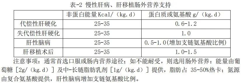 1、肝功能不全:肝硬化病人應(yīng)進(jìn)食量不足導(dǎo)致營養(yǎng)負(fù)平衡,肝硬化或肝腫瘤圍手術(shù)期、肝性腦病、肝移植后1-2周,不能進(jìn)食或接受腸內(nèi)營養(yǎng)者應(yīng)給予腸外營養(yǎng)支持(表1)。