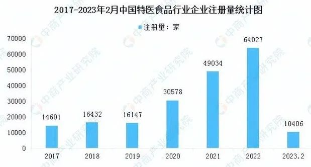 根據(jù)企查查數(shù)據(jù)顯示,目前我國(guó)現(xiàn)存特醫(yī)食品企業(yè)共計(jì)25.77萬家。從企業(yè)注冊(cè)情況來看,2017-2022年我國(guó)特醫(yī)食品行業(yè)新增企業(yè)注冊(cè)量呈現(xiàn)大幅上升的趨勢(shì),從14601家增長(zhǎng)至64027家,年均復(fù)合增長(zhǎng)率達(dá)34.40%。截止2023年2月底,中國(guó)特醫(yī)食品行業(yè)新增企業(yè)10406家。