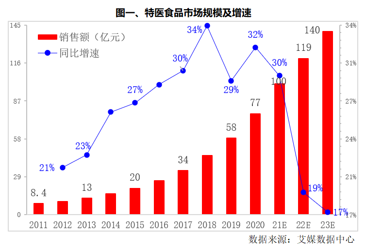 特醫(yī)食品的發(fā)展速度增長也是較快的,預(yù)計到2023年,我國特醫(yī)食品市場規(guī)模將超過100億元,達到140億元(詳情見圖一)