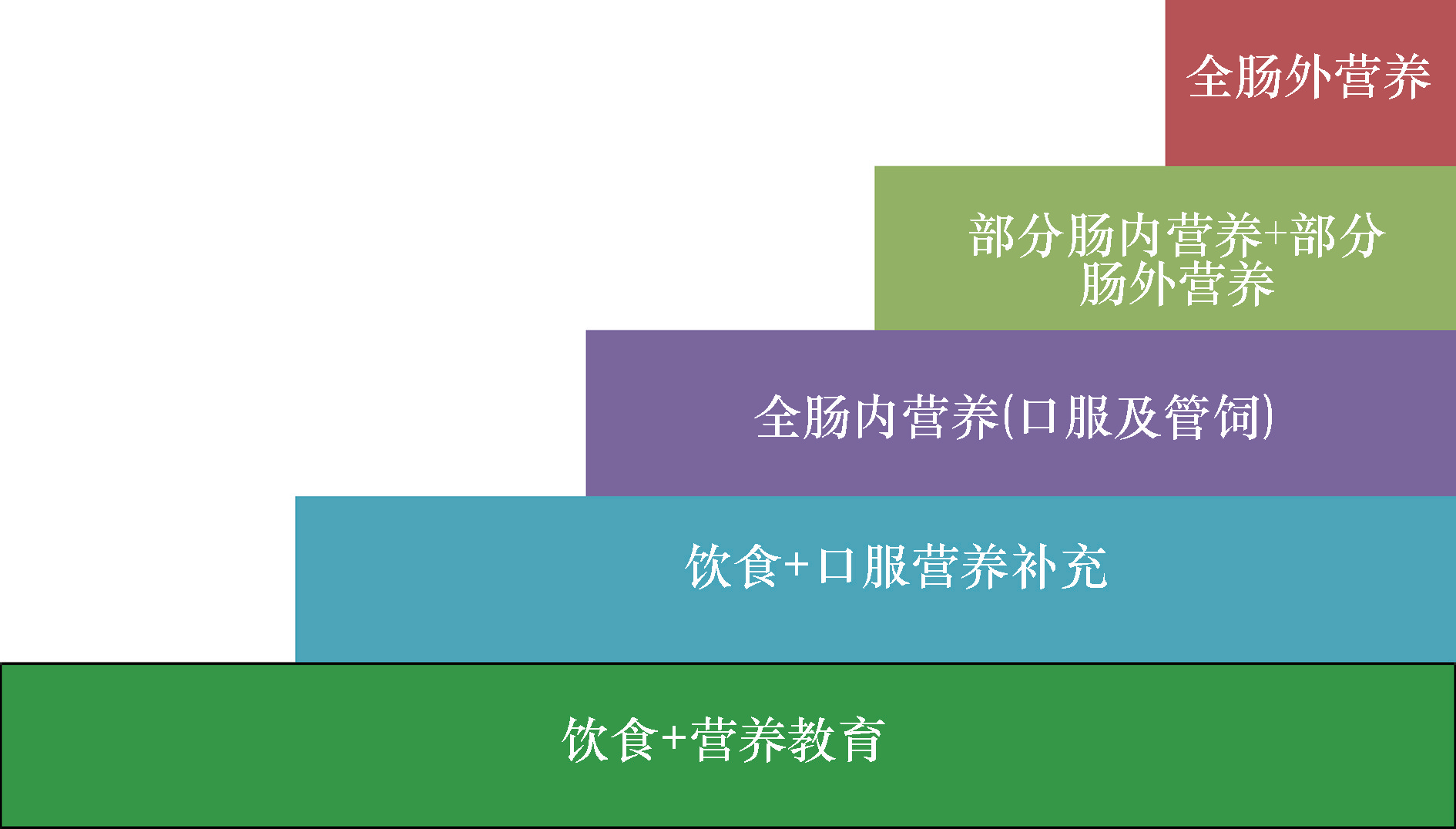 這就是五階梯營養(yǎng)治療原則,是由中國抗癌協(xié)會(huì)腫瘤營養(yǎng)專業(yè)委員會(huì)制訂并發(fā)布的一個(gè)腫瘤患者營養(yǎng)治療的指導(dǎo)思想。