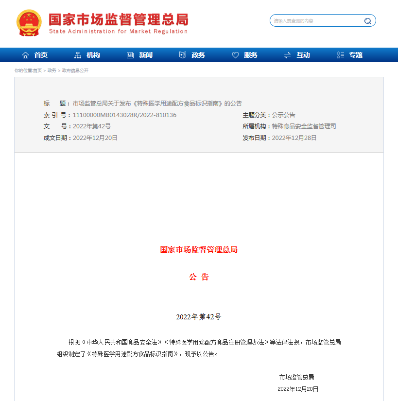 2022年底,市場監(jiān)管總局制定發(fā)布《特殊醫(yī)學(xué)用途配方食品標(biāo)識指南》(以下簡稱《標(biāo)識指南》),規(guī)定了特殊醫(yī)學(xué)用途配方食品標(biāo)識的基本要求、內(nèi)容要求、主展示版面要求等內(nèi)容。