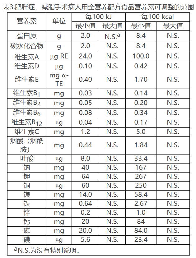 2)為保證蛋白質(zhì)和微量營養(yǎng)素的攝入,每100 kcal產(chǎn)品中應(yīng)適當(dāng)增加某些營養(yǎng)素的含量,調(diào)整范圍如表3。