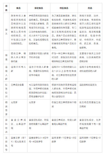 特醫(yī)食品、藥品、普通食品或保健品在產(chǎn)品的定義、用途、標簽標識法規(guī)、原料特點、形態(tài)、用法用量及管理方式上都有區(qū)別,具體如下: